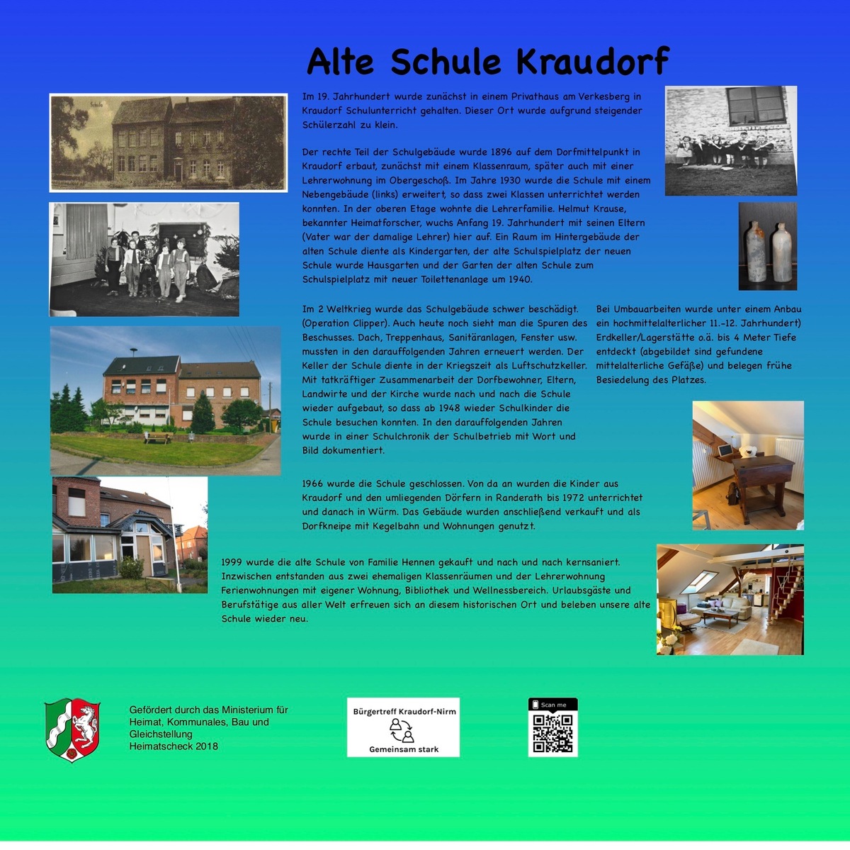 Die historische Alte Schule Kraudorf wurde von uns kernsaniert und liebevoll wieder hergerichtet für Gäste aus der ganzen Welt, die gerne hier verweilen. Wir begannen 2015 mit der ersten Ferienwohung, unserer 60 m2 großen Lehrerzimmerwohung im Dachgeschoss. Durch die positive Resonanz richteten wir in 2016 die 80m2 große Klassenzimmerwohnung mit zwei Schlafzimmern und großem Balkon als Ferienwohung ein. In 2017 erfolgte dann die Fertigstellung der 60 m2 großen Parterrewohnung mit zwei Schlafzimmern und großer Terrasse.